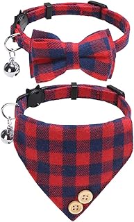 Katzenhalsband mit Fliege, 2 Packungen klassische Karomuster, Ginham-Katzenhalsbänder mit Schal und Fliege, verstellbare Größe mit Glöckchen, perfekt für Katzen, Welpen, kleine Hunde